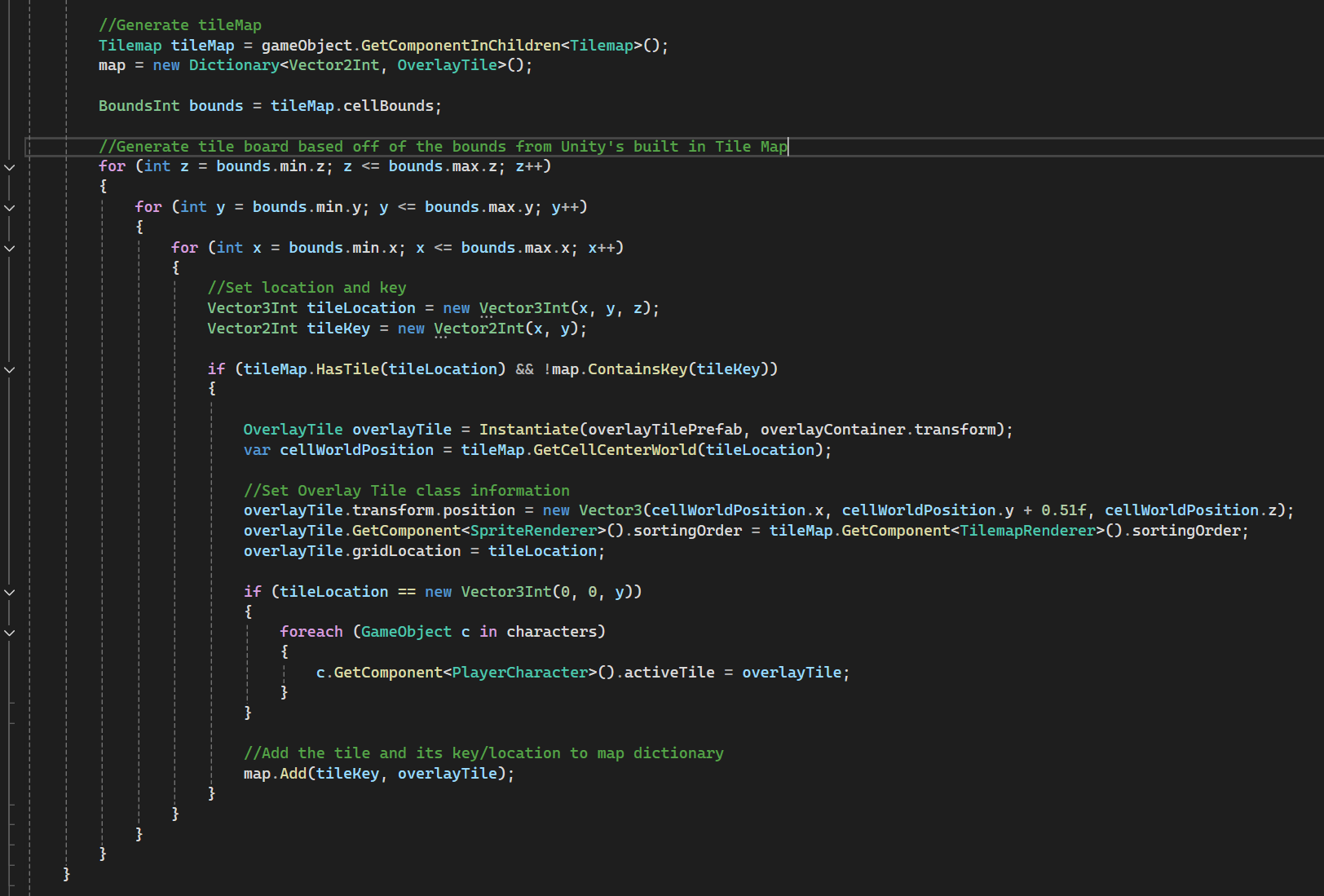 I wanted to focus on a game with grid. The setup of the grid is a crucial part that can be leveraged by the player characters, enemies, pathfinding, abilities, and so on. My goal was to make it adaptable and easy to use for my level designer. To do this I leveraged the Unity Tilemap system. This allowed the level designer to create the level sizes that they needed and this code would grab the bounds, available tiles for movement, and set a grid to be used by many other components.